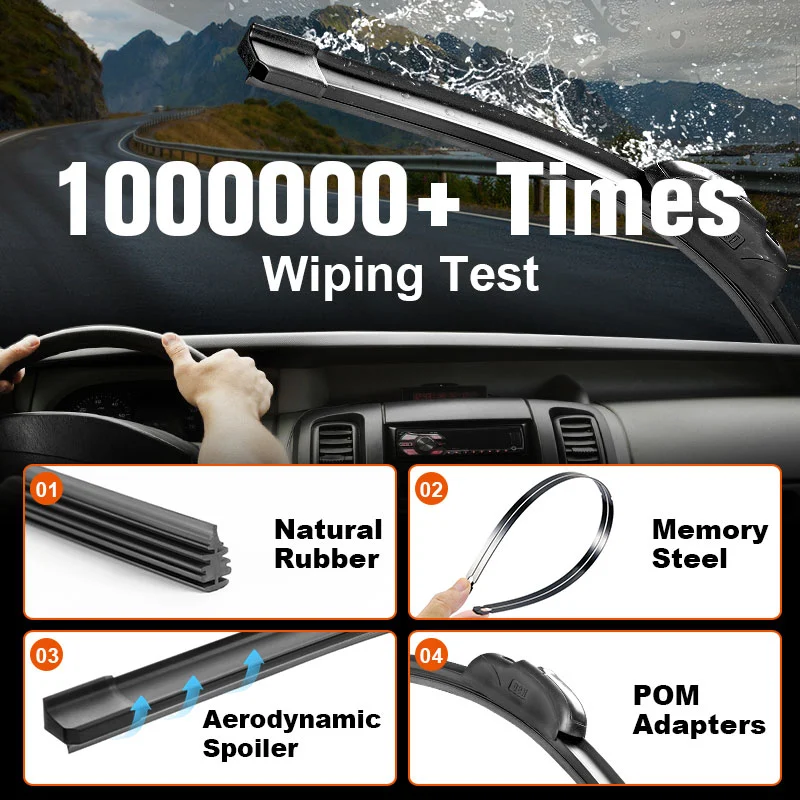 ● لا تمحو:تتوافق مساحات الزجاج الأمامي الأمامي بشكل أوثق مع سطح الزجاج الأمامي المنحني ، مما يوفر مسحًا أكثر سلاسة وأكثر هدوءًا.