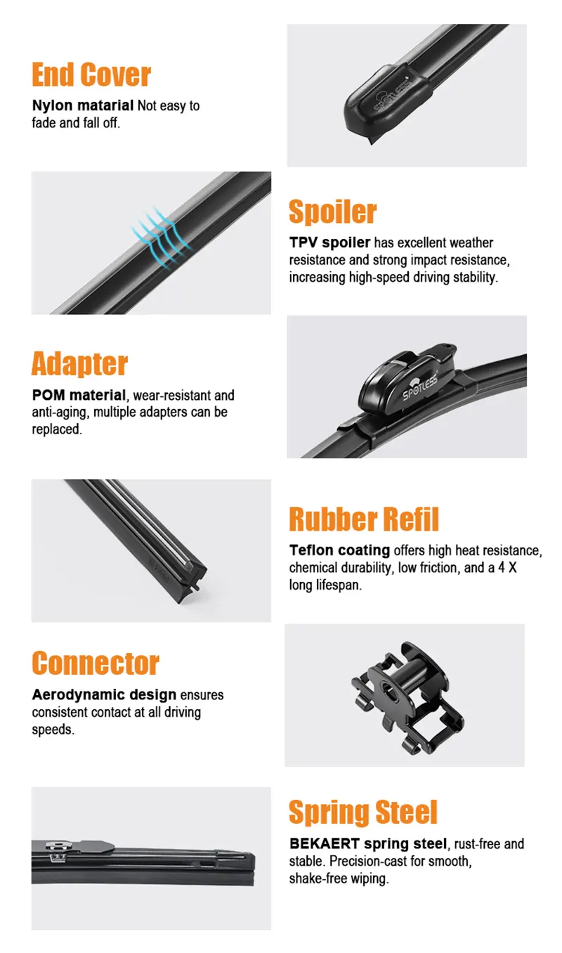 علمتنا سنوات من ردود الفعل من ورش العمل مواضع فشل المساحات: رفع الحواف تحت المطر، أو الاهتزاز عند سرعات الطرق السريعة، أو كسر الموصلات أثناء التثبيت. يعمل تصميم الرأس الداخلي الحاصل على براءة اختراع على تعزيز سبائك الفولاذ حتى لا تنكسر حتى في الطقس البارد. تتميز الحافة المطاطية بتصميم هندسي "قلب" لتبقى في المنتصف، وتم تصميم الموصلات لتناسب أي سيارة ركاب تقريبًا دون خشخشة. هذه تفاصيل صغيرة، لكنها تحدث فرقًا كبيرًا في الاستخدام اليومي.