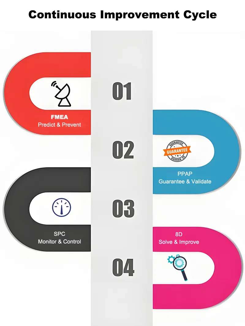 الوقاية المضمنة: نستخدم FMEA للتنبؤ بالفشل قبل الإنتاج. يتم حل المشاكل على الورق، وليس في المستودع الخاص بك. |